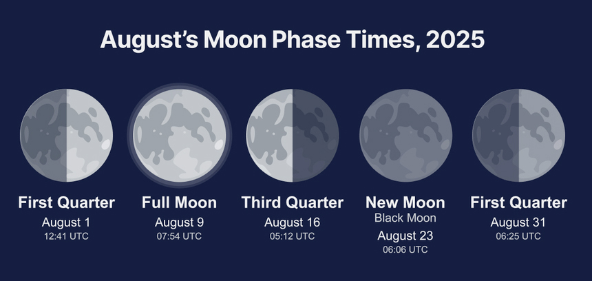 Just two weeks later, on August 23, a Black Moon will occur. This rare event marks the third New Moon in a single astronomical season containing four New Moons.Moon Phases and Timing in AugustPrimary Moon phases—New Moon, First Quarter, Full Moon, and Last Quarter—occur at exact universal times for everyone worldwide. What changes is the local time and date, which shift depending on the time zone.This is why lunar phase calendars are often tied to a specific city or region; for example, when it’s August 1, 05:00 in New York, it’s still July 31, 23:00 in Honolulu. Similarly, a Moon phase on August 31 in New York may already fall on September 1 in Sydney.Lunar Encounters with Planets