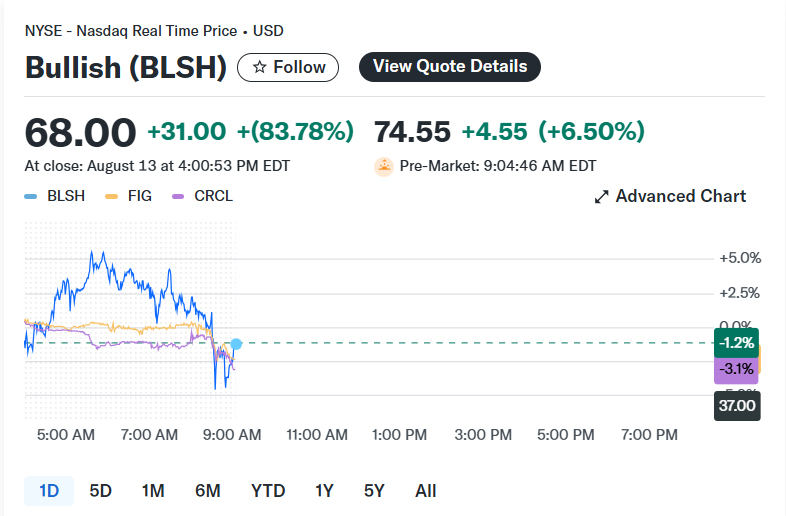Bullish’s IPO Opens to Frenzy, Hits Triple Digits Before PullbackThe stock opened at $90 at 1:00 p.m. ET, skyrocketing to $118 shortly after—more than a 215% increase from its IPO price of $37. Trading was temporarily halted at least twice within minutes due to extreme volatility.By the closing bell, Bullish’s shares had settled at $70, still representing a nearly 90% gain from the IPO price. In Thursday’s premarket session, the stock climbed another 12% to $78, valuing the company above $10 billion.Institutional Backing Fuels Market DebutAhead of the IPO, Bullish drew major institutional interest. BlackRock and Ark Invest, the firm led by Cathie Wood, signaled their intention to buy up to $200 million worth of shares, according to regulatory filings. CEO Thomas Farley, former president and COO of the NYSE Group, described the IPO as a strategic move to capitalize on what he sees as a turning point for institutional adoption of digital assets.