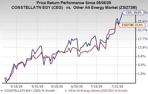 Image Source: Zacks Investment ResearchIts extensive nuclear infrastructure plays a key role in meeting the escalating electricity demands of data centers, likely driving revenue stability. The company’s active expansion into renewables, beyond its traditional nuclear focus, also positions it well for sustainable long-term growth.CEG’s emphasis on providing customer-centric, low-carbon solutions—such as carbon-free energy and renewable energy certifications—may further bolster profitability and appeal to clients aiming to reduce emissions and manage energy costs effectively.Stock Performance and ValuationIn the last three months, Constellation Energy shares have surged by 29.6%, outpacing the broader industry’s 23.9% gain. This strong rally, however, has pushed the stock to trade at a premium.