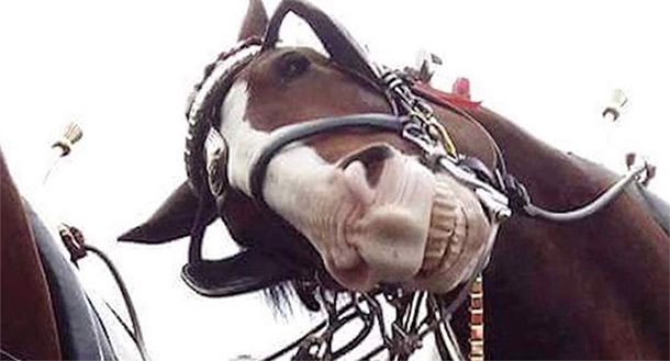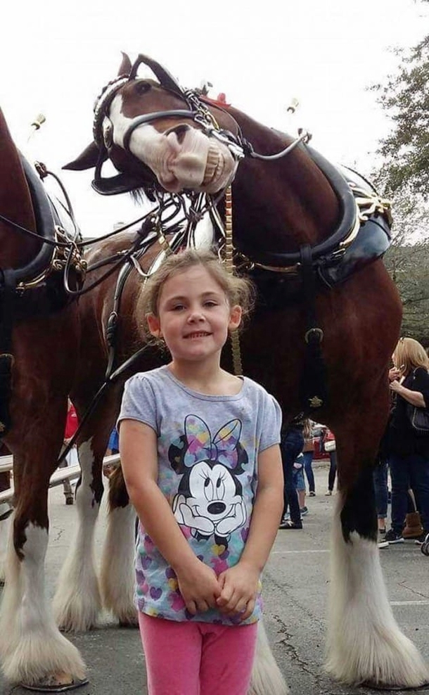 The little girl had no idea she was about to become internet-famous when she stopped to pose in front of the massive horses during a family outing. She was likely enjoying a fun day with her loved ones when she spotted the beautiful draft horses, often used to pull carts in parades and events. Enthralled by their size and elegance, she stood still as her father got ready to take a picture.As she smiled for the camera, the photographer likely said, “Say cheese!”—completely unaware that the picture would capture much more than just his daughter’s excitement. When he zoomed in, he was met with an unexpected surprise that left him bursting with laughter.An Unforgettable PhotobombThe now-viral image was originally shared on Reddit in 2016, quickly catching the attention of internet users worldwide. According to Time, the original post came from an account that has since been deleted, making its true origins a bit of a mystery. However, some believe it may have first been posted by The Wolf 101.5 FM.