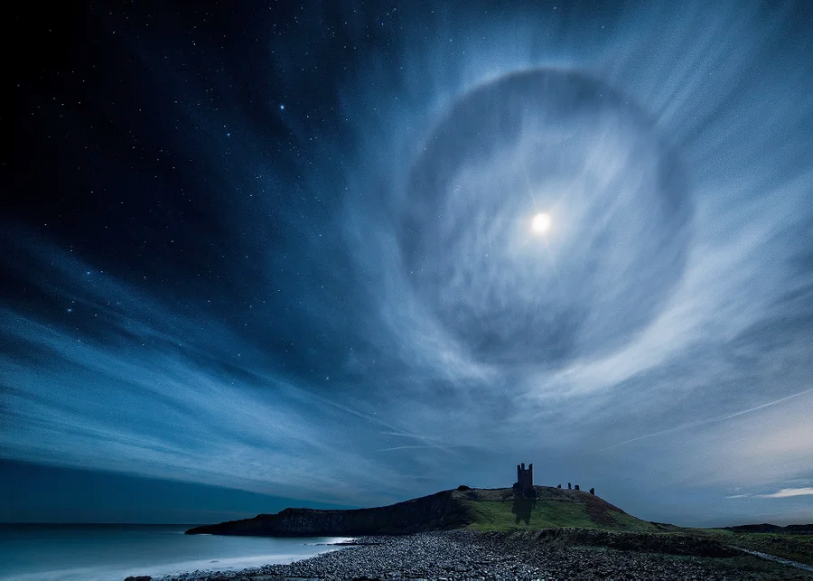 A 22-degree moon halo over Dunstanburgh Castle in Northumberland, England. Credit: Northern Nights Photography/Alamy Stock PhotoThe Elusive Fire Cloud and Light Pillar