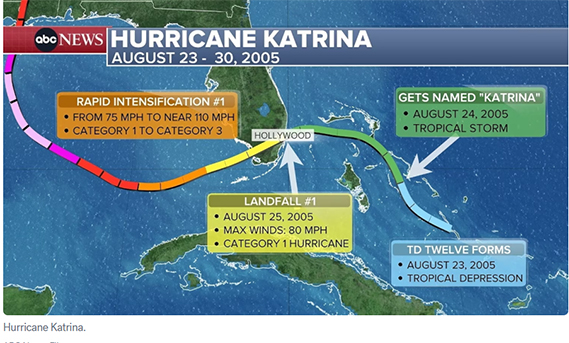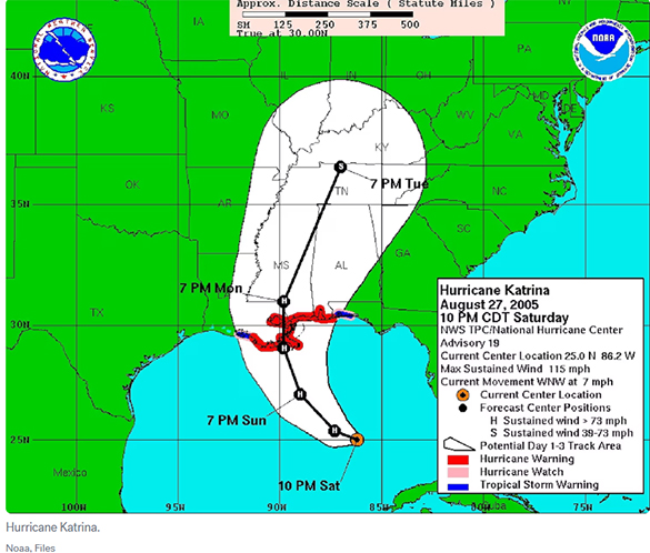 By August 23, the system strengthened into a tropical depression, and within 24 hours, it reached tropical storm status with sustained winds of 40 mph. At that moment, it was officially named Katrina.Katrina moved westward toward South Florida, intensifying into a hurricane just hours before making landfall on August 25 near Hollywood, Florida. With sustained winds of 80 mph, it caused flooding and power outages before weakening over the Everglades. By August 26, the storm reemerged in the Gulf of Mexico, poised to strengthen dramatically.Rapid intensification over the GulfOnce over the warm waters of the Gulf, Katrina began a period of rapid intensification. With unusually high sea surface temperatures and low wind shear, the storm had near-perfect conditions to strengthen.On August 26, Katrina’s winds jumped from 75 mph to nearly 110 mph in less than 24 hours, making it a strong Category 2 storm. The following day, after briefly weakening due to an eyewall replacement cycle, Katrina exploded in strength once again. By August 28, it reached Category 5 status with maximum sustained winds of 175 mph, becoming the strongest hurricane ever recorded in the Gulf of Mexico at that time.Although Katrina later weakened slightly before landfall, its massive wind field and storm surge potential made it a catastrophic threat to the Gulf Coast.Dire forecasts and urgent warningsAs Katrina barreled toward Louisiana and Mississippi, forecasters sounded unusually grim alarms. The National Weather Service office in New Orleans issued stark warnings on August 28, declaring that “most of the area will be uninhabitable for weeks…perhaps longer.” The advisory even warned of “certain death” for those caught outside during the storm, language rarely used in official forecasts.That same day, New Orleans Mayor Ray Nagin ordered the first-ever mandatory evacuation of the city. More than one million people across the region fled inland, though tens of thousands remained behind due to lack of transportation, finances, or willingness to leave.Katrina’s landfalls and destructionOn the morning of August 29, 2005, Katrina made its second landfall in Plaquemines Parish, Louisiana, as a Category 3 storm with winds of 125 mph. Its massive wind field extended nearly 120 miles from the center, bringing destructive gusts across much of the Gulf Coast.