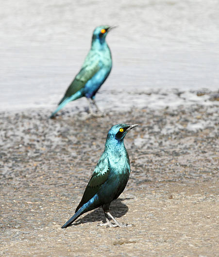 Scientifically named Lamprotornis chalybaeus, this species is also referred to as the greater blue-eared glossy-starling, green glossy starling, or simply blue-eared starling. Despite their commonness in many parts of Africa, their beauty often surprises birders unfamiliar with the striking colors starlings can display. Averaging 8.5–9.5 inches in length with a wingspan between 15–17 inches and a weight ranging from 2.7 to 5.6 ounces, these starlings are compact, robust birds with a commanding presence.Vivid Features and Bold BehaviorThe Greater blue-eared starling is easy to identify, thanks to its upright stance, stout bill, and short tail. Its iridescent teal-blue feathers shimmer with a metallic gleam in good lighting, while a blue-black facial patch gives the appearance of a mask. The wings display two distinctive bars formed by evenly spaced black spots. Underneath, the plumage deepens into rich blue-purple shades along the abdomen and flanks. The bird's brilliant yellow or orange-yellow eyes stand out dramatically against the darker facial feathers, and its legs and feet are typically gray-black.