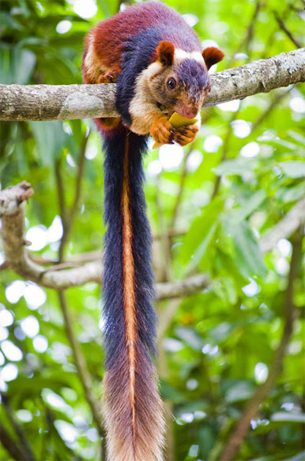 “These are giants!” said Koprowski, a professor and associate director at the University of Arizona’s School of Natural Resources and the Environment, in an interview with The Dodo. Their large size isn’t their only striking feature—their fur is absolutely breathtaking.A Coat of Many ColorsThe Indian giant squirrel boasts one of the most eye-catching coats in the animal kingdom. Their fur features an extraordinary mix of colors rarely seen in mammals—deep maroon, violet, orange, rust, brown, and jet black. These vibrant shades are more than just beautiful; they serve an important purpose.