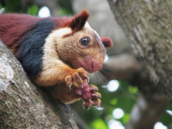 These remarkable squirrels are perfectly adapted to life high in the canopy of India's forests. They rarely descend to the ground and spend most of their lives leaping from branch to branch. They are capable of incredible jumps—sometimes covering distances of over 20 feet!Spotting one in the wild is no easy task. Found primarily in the forests of southern and eastern India, Malabar giant squirrels are shy and elusive. “One of my friends in India told me the best way to see them is to climb up a tree, stay very quiet, and wait for them to come out of their nests,” said Pizza Ka Yee Chow, a squirrel researcher at Hokkaido University.A Unique Diet and Appearance