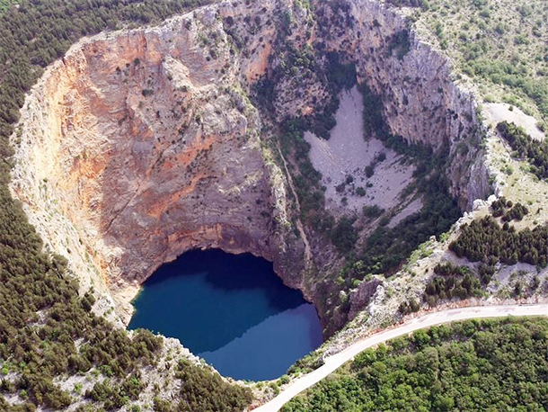 Near Imotski, Croatia, this karst lake sinkhole is known for the reddish iron-stained cliffs surrounding it. Although called Red Lake, its waters are blue. It is home to rare fish species like the spotted minnow and the endangered Imotski spined loach.