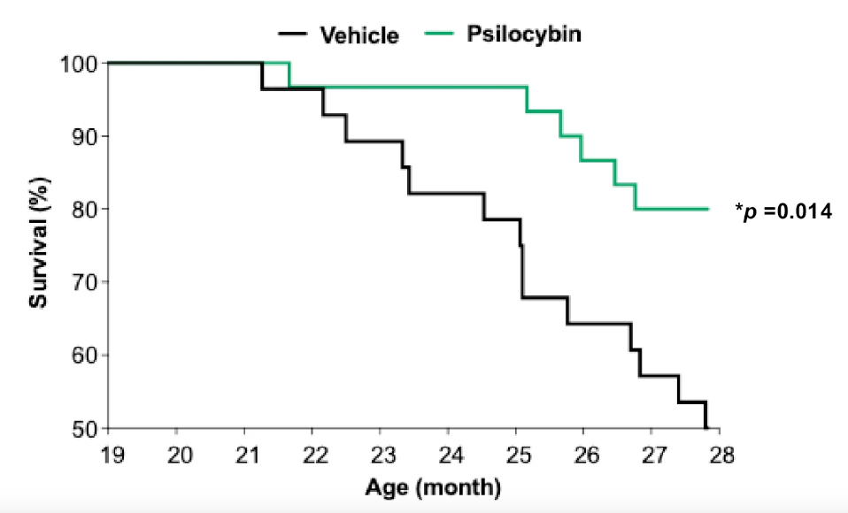 - 80% of psilocybin-treated mice survived the entire period,