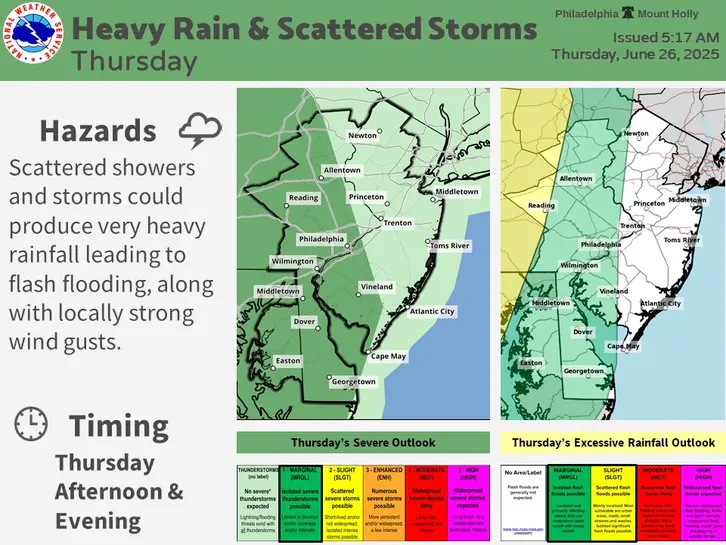 According to the National Weather Service (NWS), the arrival of the system on Thursday will mark the beginning of cooler, yet unstable weather conditions across eastern Pennsylvania and the surrounding areas.Storm Front Brings Risk of Heavy Rain and FloodingRain and thunderstorms are forecast to begin after 2 p.m. Thursday, and while not everyone will experience the same effects, areas hit hardest by the system could see intense rainfall, wind gusts, and flash flooding. The NWS has placed much of eastern Pennsylvania under a "marginal" risk level for excessive rainfall and severe thunderstorms — meaning isolated flooding and damaging winds are possible.AccuWeather meteorologists emphasized that this "backdoor cold front" will usher in major changes. “It can dramatically drop temperatures by 20 to 40 degrees in some cases,” said Brett Anderson, Senior Meteorologist at AccuWeather. Such a significant drop is unusual for this time of year and could create sharply contrasting conditions across the region.Flash Flooding, High Winds, and Temperature Drops Expected