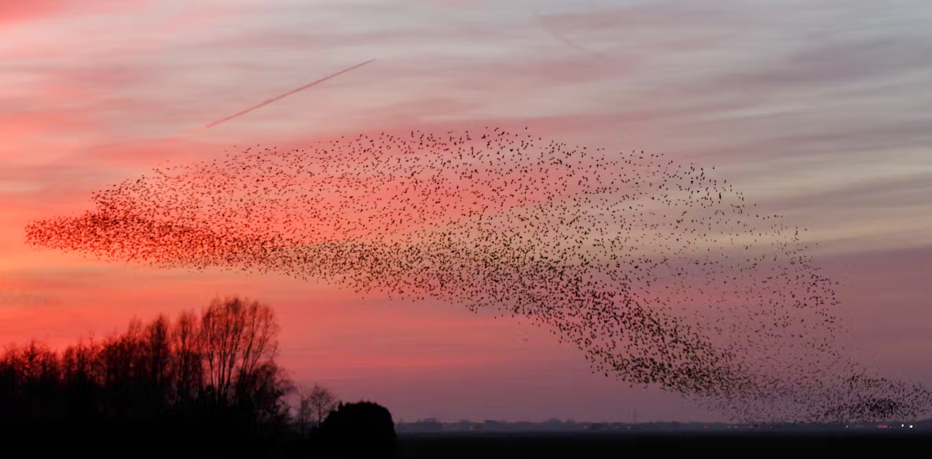 In 2010, researchers publishing in the Proceedings of the National Academy of Sciences sought to understand murmuration dynamics using physics. They discovered that starling flocks exhibit “scale-free correlation,” meaning that each bird’s movement influences—and is influenced by—many others in the group, regardless of distance.