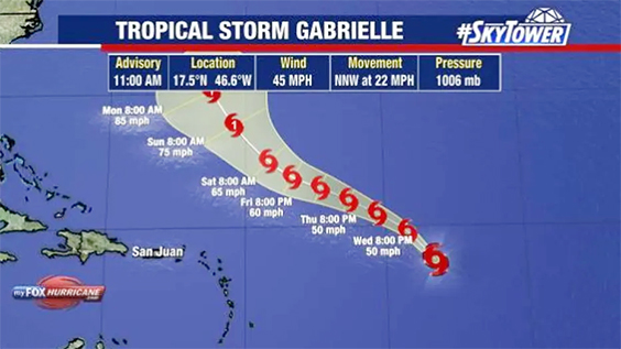 While tropical systems often spark concerns for residents along the Atlantic coast, meteorologists stress that Gabrielle is not expected to pose a threat to the United States. Instead, the storm will likely track northward into open waters, with only Bermuda having a slight chance of seeing impacts. Still, as with all tropical systems, forecasters remain cautious and continue to monitor its progress closely.Current position and storm detailsAs of 11 a.m. on Wednesday, Tropical Storm Gabrielle was located near latitude 17.5°N and longitude 46.6°W. That position places the system more than 1,000 miles east of the Northern Leeward Islands in the central Atlantic. At the time of the update, the storm carried maximum sustained winds of 45 miles per hour, with higher gusts possible.Gabrielle was moving north-northwest at 22 miles per hour, a fairly quick pace compared to other developing systems. Meteorologists note that the forward speed combined with favorable atmospheric conditions could contribute to steady strengthening over the next several days.Forecast path and intensity outlookMeteorologists expect Gabrielle to continue on its northward track, gradually intensifying as it moves across the Atlantic. Forecast models largely agree that the system will become a hurricane by the weekend. If this projection holds, Gabrielle will join the list of hurricanes that formed far from land and remained primarily a concern for shipping lanes and ocean activity.By early Monday morning, current models show Gabrielle well east of the United States coastline, curving northward into the open Atlantic. The storm is not expected to approach Florida or the southeastern U.S., which often see closer tropical threats during hurricane season.Possible impacts for BermudaWhile the majority of forecast models keep Gabrielle away from major landmasses, meteorologists say Bermuda could see some indirect effects depending on the exact track. FOX 13 Meteorologist Dave Osterberg explained that the island is the only location with even a slight chance of experiencing impacts from Gabrielle.