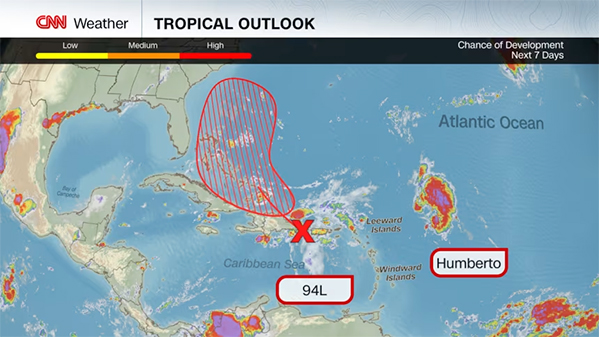 Tropical Storm Humberto is spinning in the west-central Atlantic Ocean, steadily intensifying as it tracks northwest. While it is not expected to directly strike the United States, forecasters warn it could rapidly strengthen into a major hurricane this weekend, posing a concern for Bermuda and shipping lanes. However, Humberto may not be the biggest threat in the tropics right now. Behind it, another disturbance known as Invest 94L is taking shape over the northern Caribbean, raising the possibility of Tropical Storm Imelda forming within days.