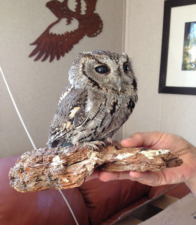 Because Zeus had only about 10% of his vision, returning him to the wild would have been unsafe. He simply wouldn’t survive on his own. Instead, the team at the Wildlife Learning Center in Sylmar, California, offered him a permanent home. He now resides in a cozy tree trunk placed atop a filing cabinet right next to the desk of Paul Hahn, the center’s founder.